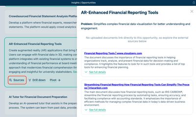 Our drill down function allows you to explore generated opportunities from other creative angles. It re-generates opportunities from other creative perspectives, so that you can continue your creative process. At any time, you can return to the original opportunity.